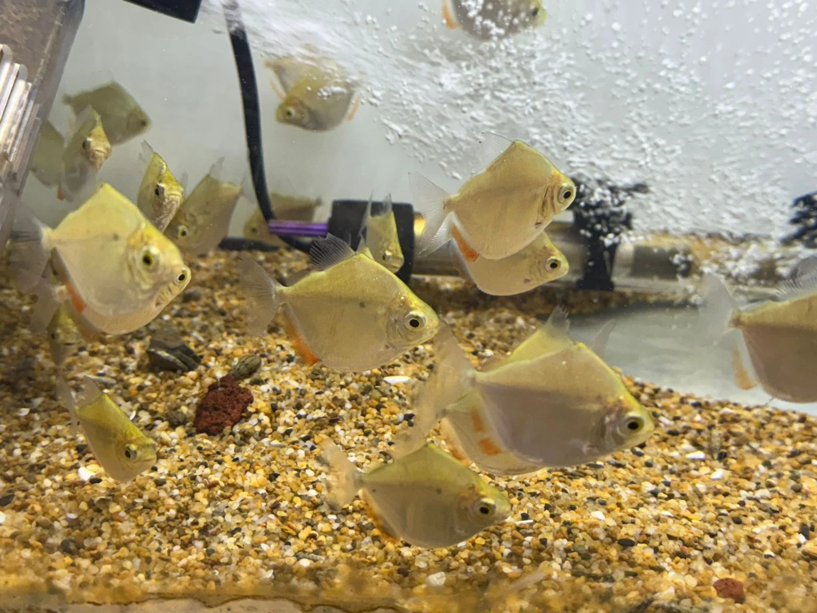Actualmente come: trozos de pescado, camarón, papilla y charales, pellet